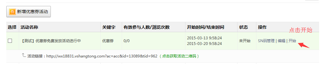 ② 允许所有用户参加,即只要查看到该活动的用户都可以领取优惠券。这种方式可以生成二维码和活动链接(可放在自定义菜单),方便更多渠道的去宣传。